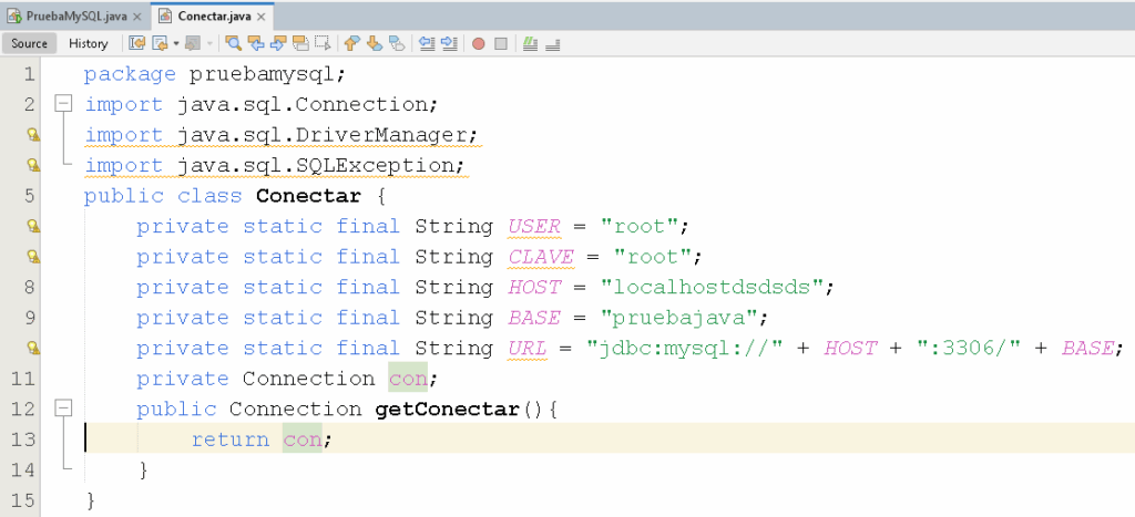 A continuación, creamos un método para la clase para que regrese un valor de tipo Connection y nos aseguramos de regresar la variable que previamente creamos.