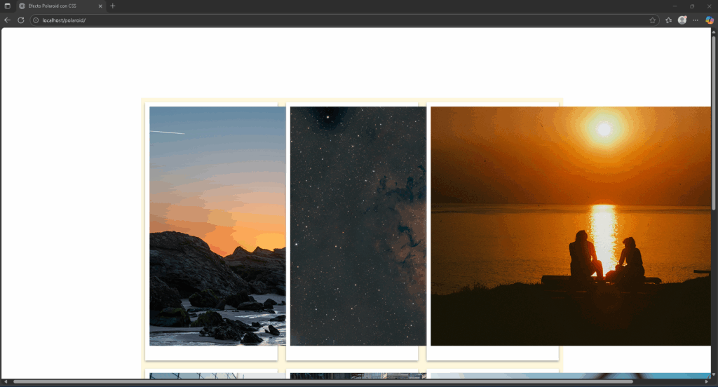 Para hacer que las imágenes se ajusten, simplemente le decimos a nuestra hoja de estilos que todas las imágenes que están dentro de un enlace que pertenezca al objeto polaroid, deben tener un ancho de 100%.